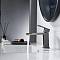 Излив этого смесителя для раковины фиксированный и оснащён аэратором, который способствует более равномерному и мягкому потоку воды. В комплекте идёт гибкая подводка со стандартным подключением 1/2", что упрощает процесс установки.