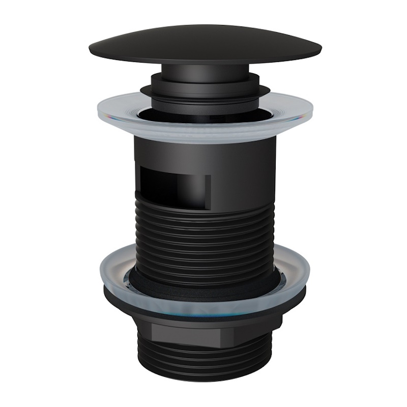 Донный клапан нажимной с переливом в матовом черном цвете. Плавное нажатие механизма CLICK-CLACK без заеданий и протечек. Матовая поверхность скрывает следы воды и загрязнений, а нержавеющая сталь гарантирует долгий срок службы. Подходит для современных ванных, где важна эстетика и удобство ухода.