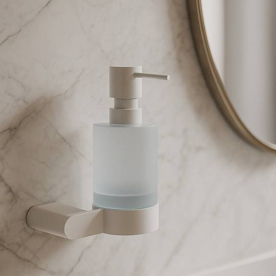 Белый подвесной дозатор — свежесть и чистота в каждой детали. Плавный механизм подачи мыла, оптимальная порция для рук и долговечный корпус из нержавеющей стали SUS 304. Объем 200мл.