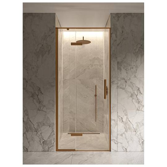 Дверь в нишу шириной 90 см с бронзовым профилем и прозрачным стеклом 8 мм. Теплый оттенок бронзы добавляет уют и премиальность любой ванной. Покрытие Smart Clean — минимальные следы воды. Матовый алюминиевый профиль — надежность и стиль. Полная комплектация для установки.