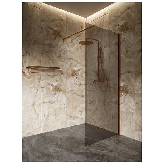 Роскошный вариант душевого ограждения Walk-In с бронзовой матовой рамкой и тонированным стеклом. Smart Clean облегчает уход, алюминиевый профиль обеспечивает долговечность, а современный дизайн придает ванной комнате изысканный вид.