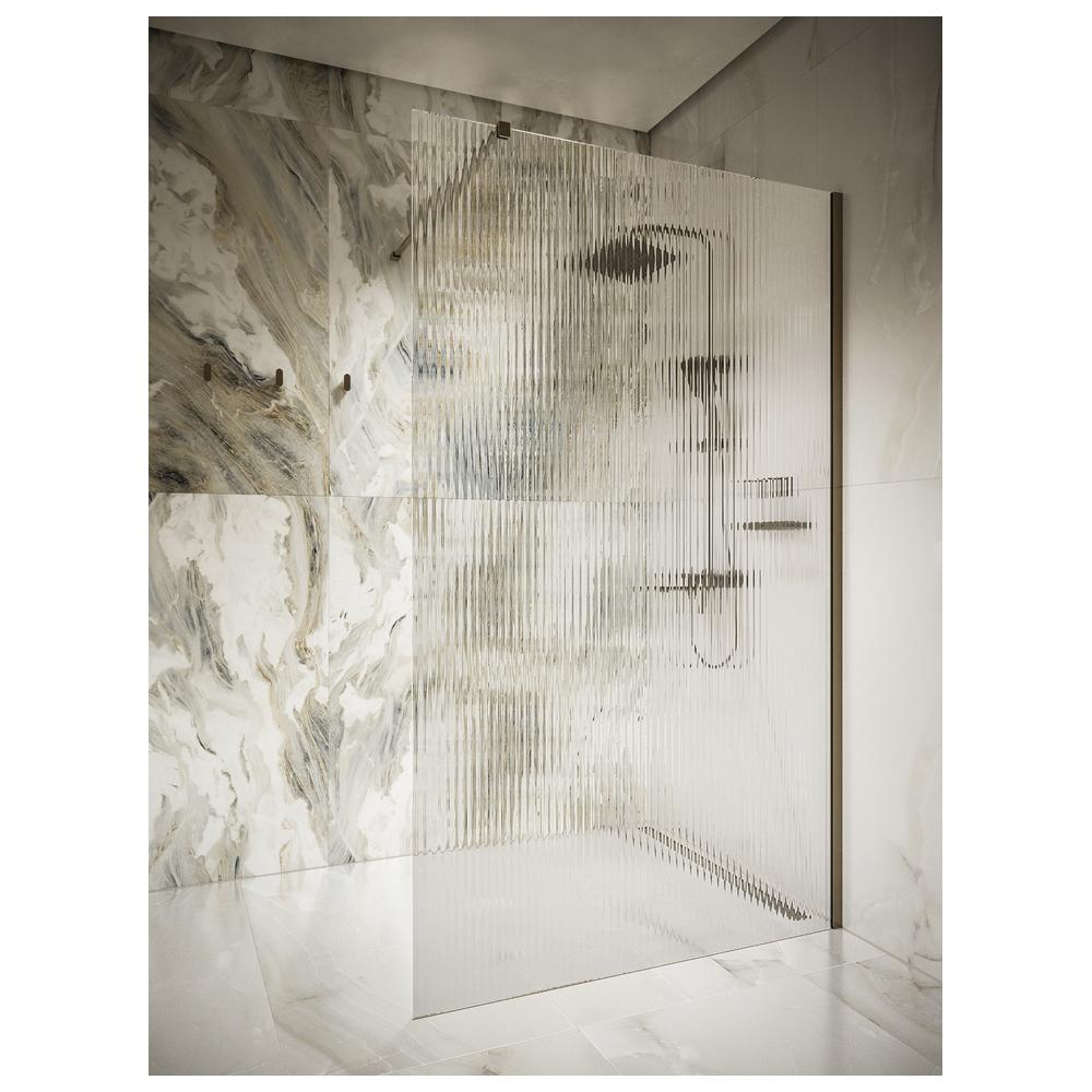 Широкое душевое ограждение 120 см для создания ощущения просторной и стильной ванной комнаты. Вороненый алюминиевый профиль и ребристое стекло создают премиальный эффект.