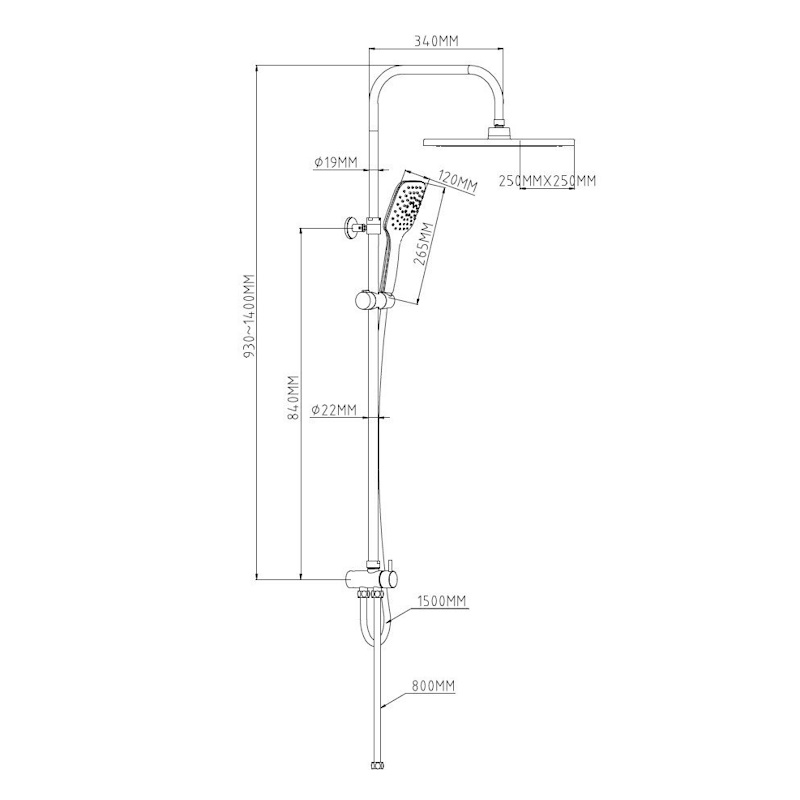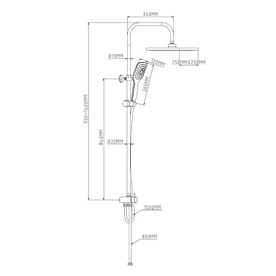 Выдвижная телескопическая стойка (нерж. сталь, хром): высота функциональная 930 -1400мм,  диаметр 22мм, вылет верхнего душа 340мм, держатель лейки плавающий FightFix