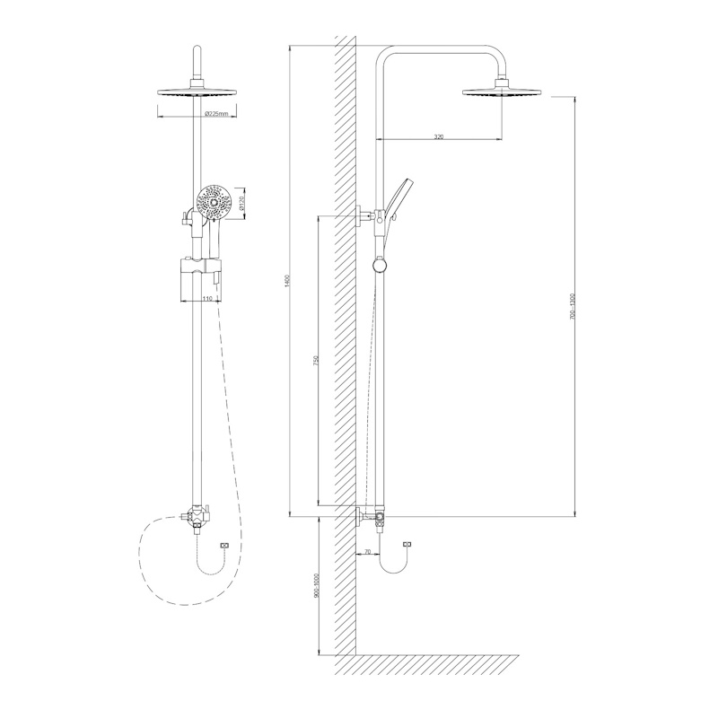 Выдвижная телескопическая стойка (нерж. сталь, хром): высота функциональная 930 - 1400мм,  диаметр 22мм, вылет верхнего душа 340мм, держатель лейки плавающий FightFix.