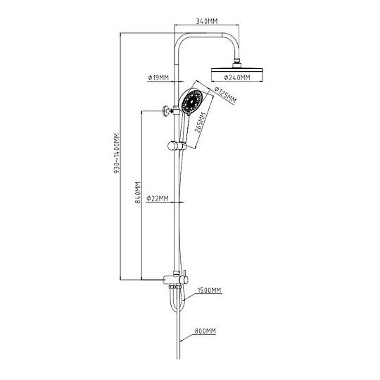 Выдвижная телескопическая стойка (нерж. сталь, хром): высота функциональная 930-1400мм,  диаметр 22мм, вылет верхнего душа 340мм, держатель лейки плавающий FightFix.