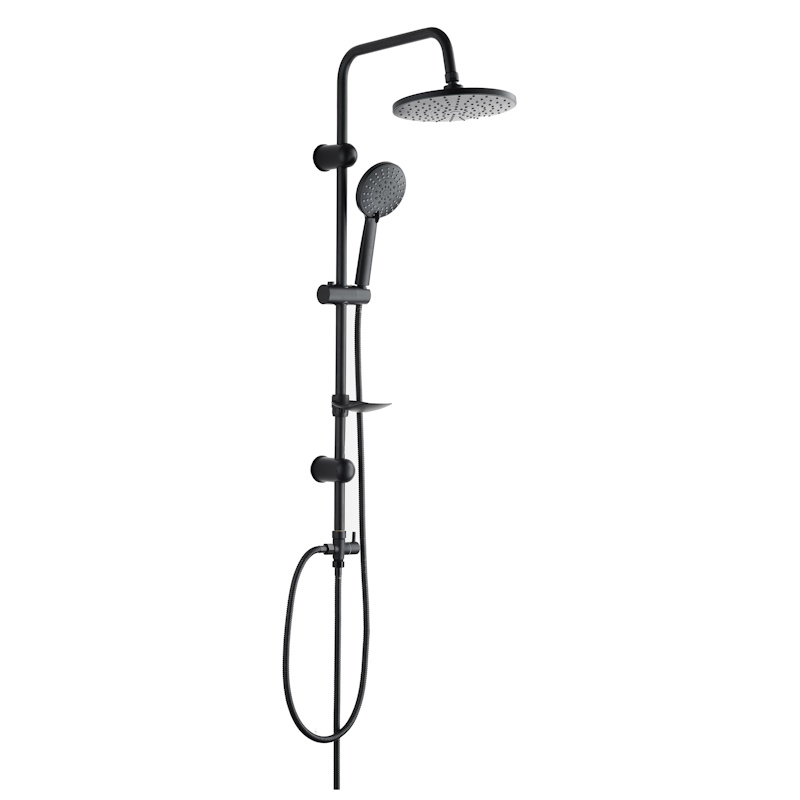 Состоит из верхней и ручной леек, шланга и штанги, цвет матовый черный. Верхняя лейка регулируется под нужным углом засчет шарнирного крепления. Диаметр верхнего душа 220 мм. Вынос верхнего душа 330 мм. Круглая ручная лейка имеет пять режимов струи: нежный широкий Spray, интенсивный, создающий освежающий и упругий поток воды Massage, и комбинированный Spray + Massage, массаж пузырьками, дождь и Массаж пузырьками. Диаметр 150 мм. Круглая ручная лейка устанавливается на держатель, регулируемый по высоте, повороту и наклону. Лейки имеют систему защиты от известковых отложений Self-Clean Device. Шланг для подключения к смесителю и душевой изготовлены из металла с двойной сцепкой (шланг 150 см и 40 см). Штанга для душа 900 мм. Механический переключатель между верхним душем и ручной лейкой сделан из латуни. Регулируемая мыльница сделана из АBS-пластика. Порошковое покрытие устойчиво к истиранию. Крепления для установки штанги в комплекте