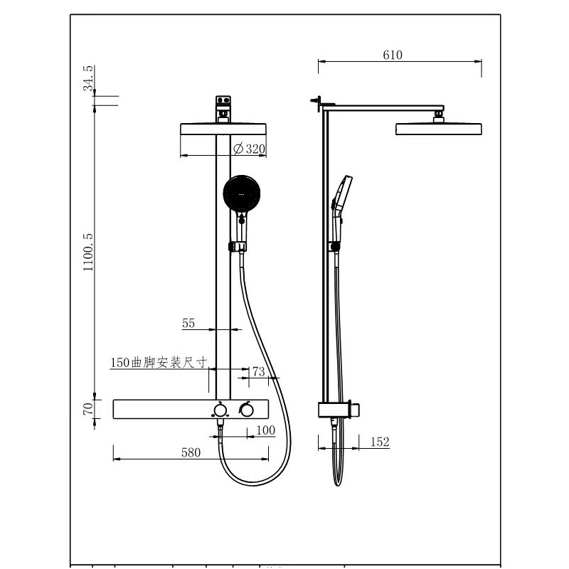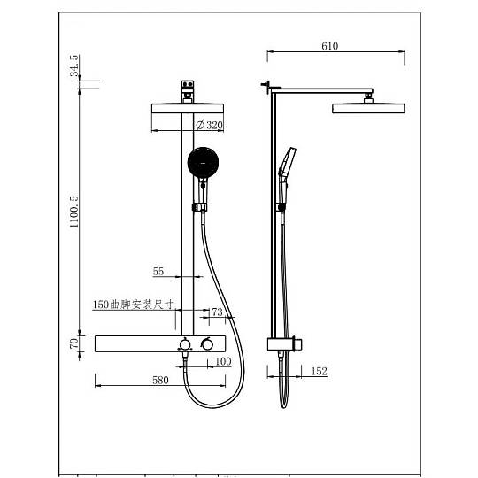 Верхний душ, душевая штанга с держателем лейки, ручной душ, смеситель (без излива), шланг