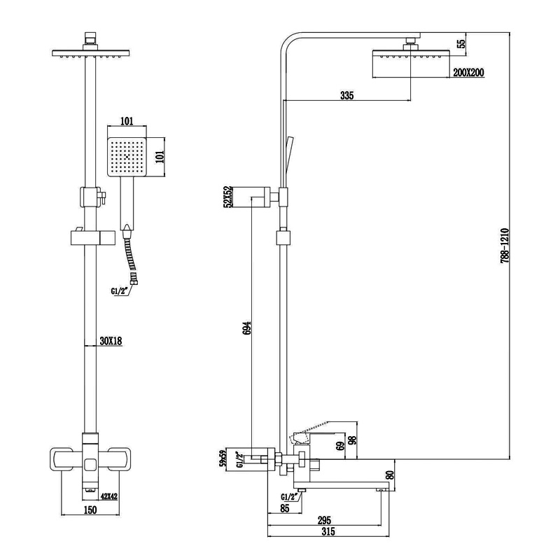 Верхний душ, душевая штанга с держателем лейки, ручной душ, смеситель, шланг