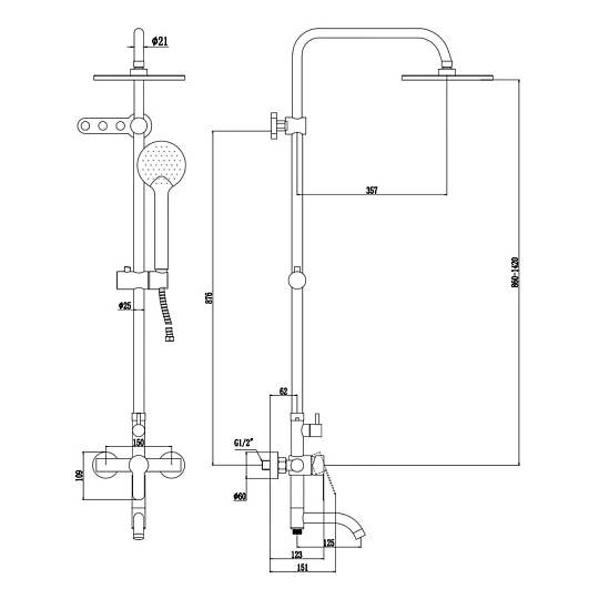Верхний душ, душевая штанга с держателем лейки, ручной душ, смеситель, шланг