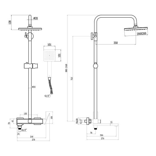 Верхний душ, душевая штанга с держателем лейки, ручной душ, смеситель, шланг