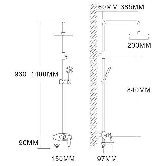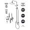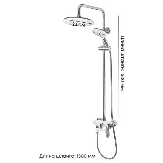 Верхний душ, душевая штанга с держателем лейки, ручной душ, смеситель, шланг, эксцентрики, декоративные отражатели
