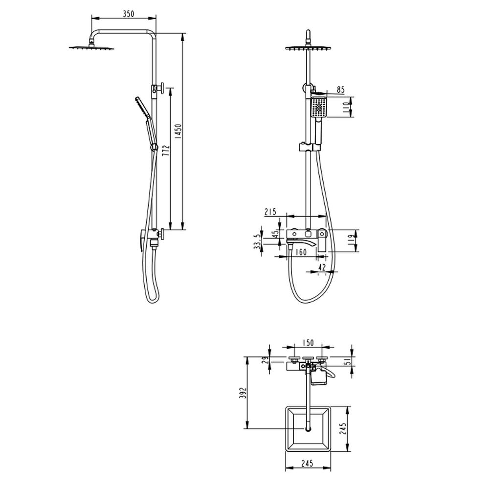 Верхний душ, душевая штанга с держателем лейки, ручной душ, смеситель, шланг, эксцентрики, декоративные отражатели