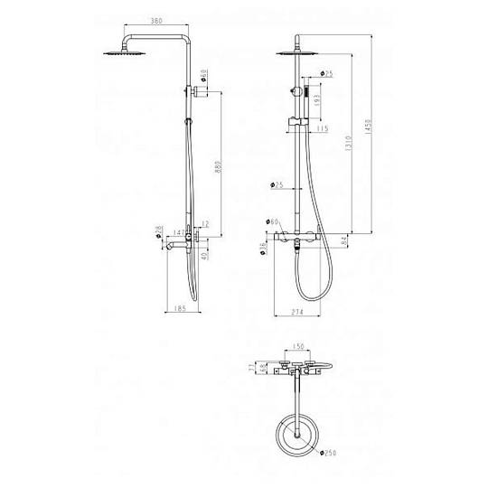 Верхний душ, душевая штанга с держателем лейки, ручной душ, смеситель, шланг, эксцентрики, декоративные отражатели