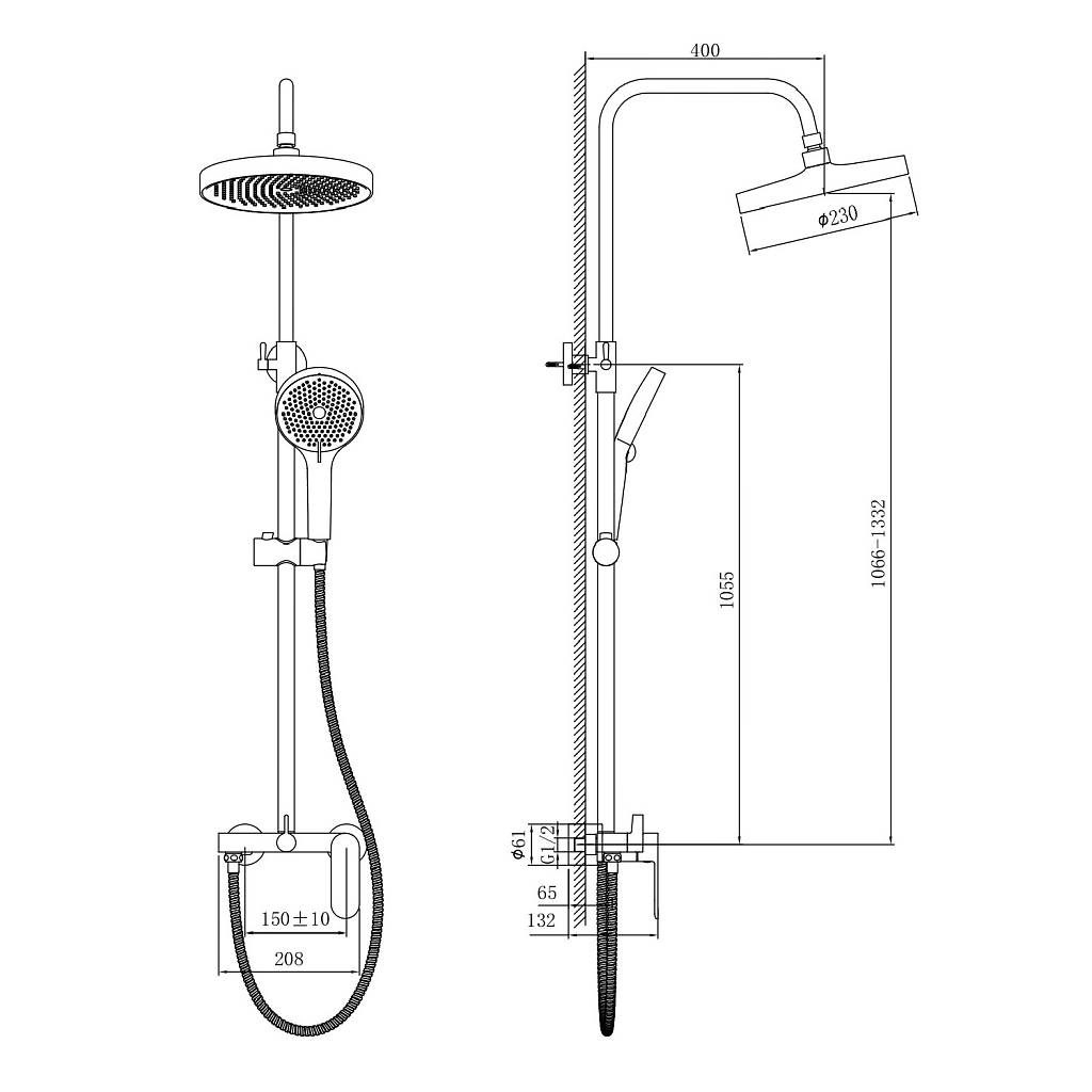 Полная комплектация: система готова к установке сразу из коробки. В наборе: стойка высотой 1332 мм, верхний душ, ручная лейка, гладкий шланг длиной 150 см, эксцентрики и весь необходимый крепёж.