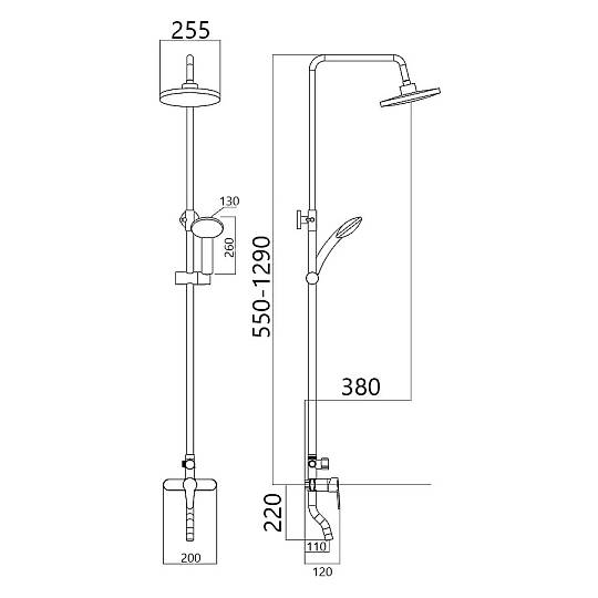 Система включает всё необходимое для комфортного принятия душа: компактный поворотный излив, верхний душ диаметром 255 мм и ручную лейку. Оба душевых элемента выполнены из прочного ABS‑пластика и оснащены силиконовыми форсунками, которые не только продлевают срок службы устройств, но и позволяют без труда удалять известковый налёт. Верхний душ можно регулировать по наклону вдоль всей оси благодаря надёжному шарниру, а высота душевой штанги из нержавеющей стали также настраивается под индивидуальные потребности.