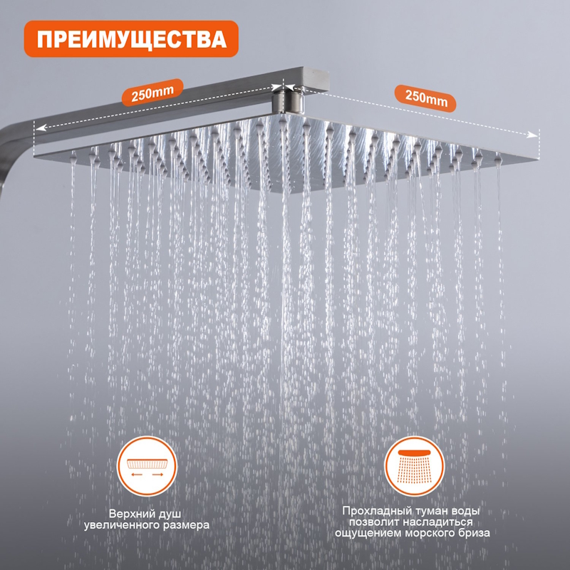 Верхний душ размером 250х250 мм регулируется по высоте благодаря телескопической штанге и по наклону с помощью встроенного шарнира, что обеспечивает максимальный комфорт и удобство использования. Самоочищающиеся силиконовые форсунки предотвращают образование известкового налета и сохраняют чистоту и силу потока воды.