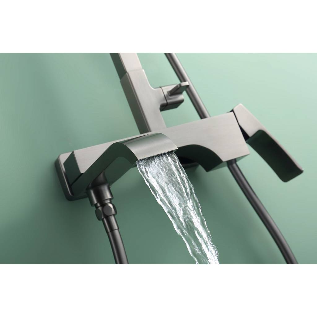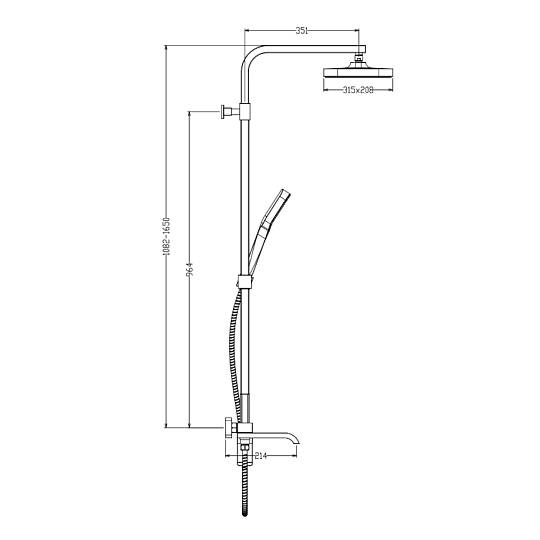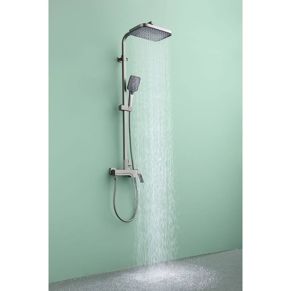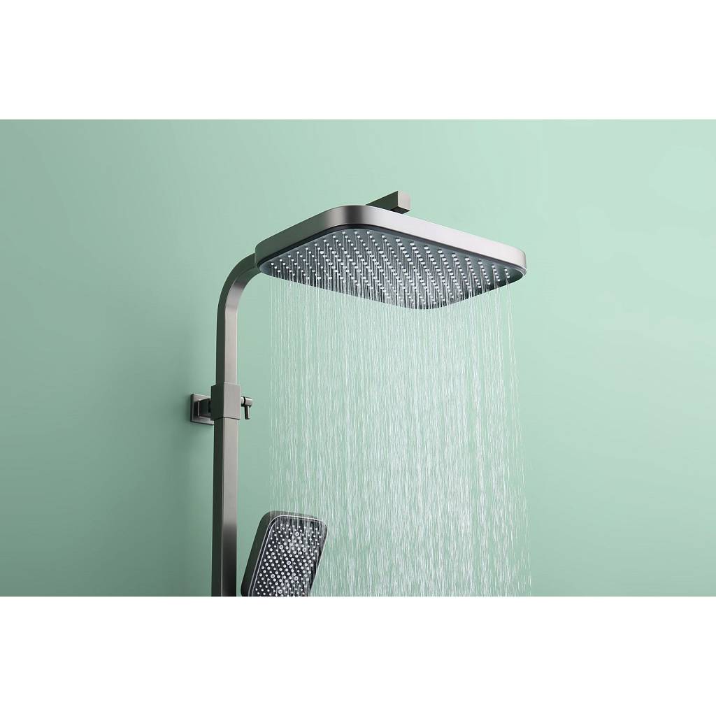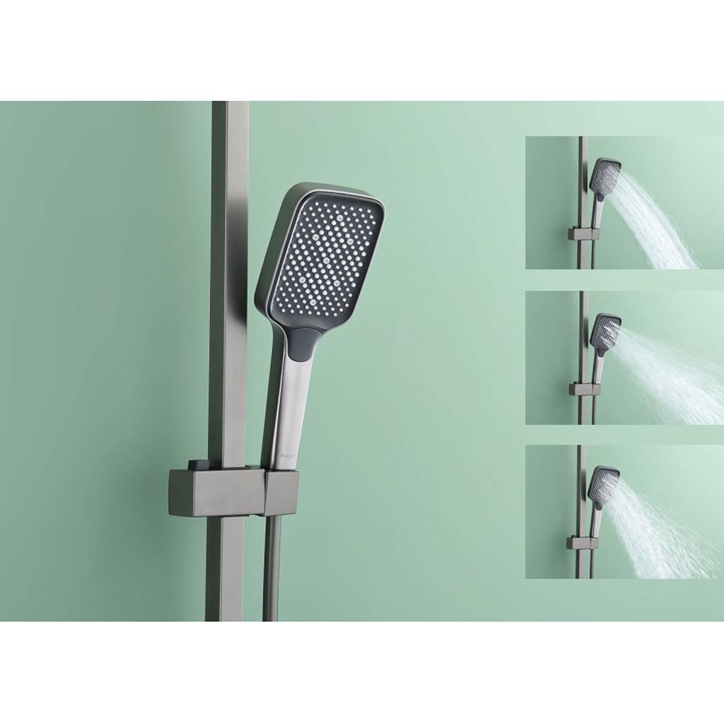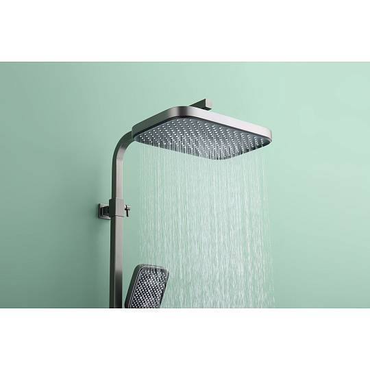 Душевая система Raglo R02.24.09. Цвет: графит. Материал: латунь. Управление: однорычажное. Механизм: керамический картридж. Излив: поворотный. Аэратор. Тип излива: каскадный. Регулируемая по высоте душевая штанга: 1082-1650 мм. Форма верхнего душа: прямоугольная. Размер верхнего душа (ШхД): 315х208 мм. Регулируемый по высоте и наклону держатель ручного душа. Форма ручного душа: прямоугольная. Количество режимов струи ручного душа: 3. Отверстия для монтажа: 3. Стандарт подводки: G 1/2. Монтаж: на стену.