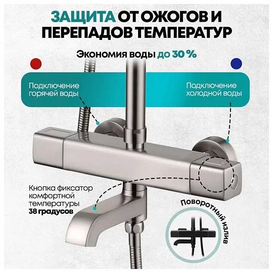 Термостатическая душевая система Grocenberg обеспечивает максимальный комфорт и безопасность во время принятия водных процедур. Управление температурой воды осуществляется посредством термостатического картриджа. Вы всегда сможете выставить для себя постоянную комфортную температуру, а так же менять её плавным движением терморегулятора.