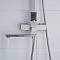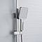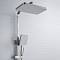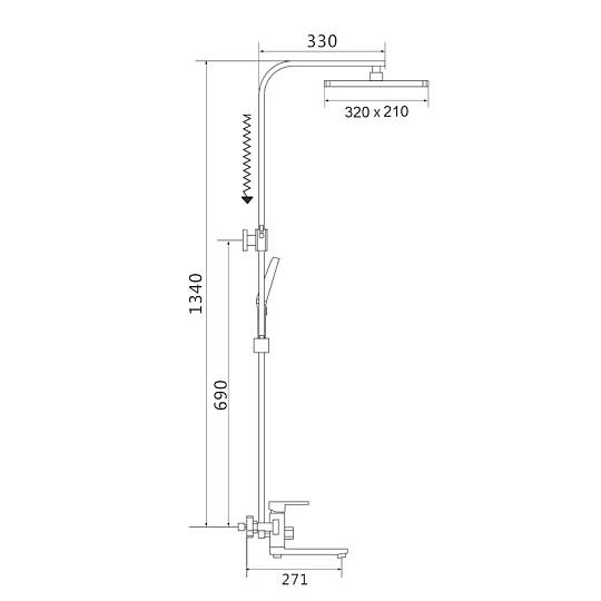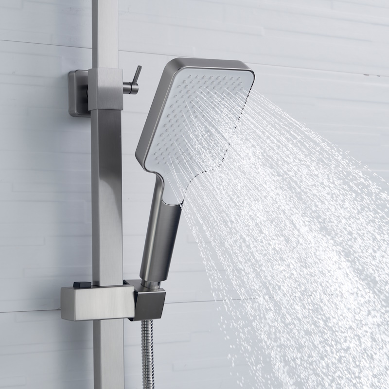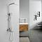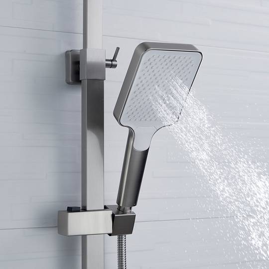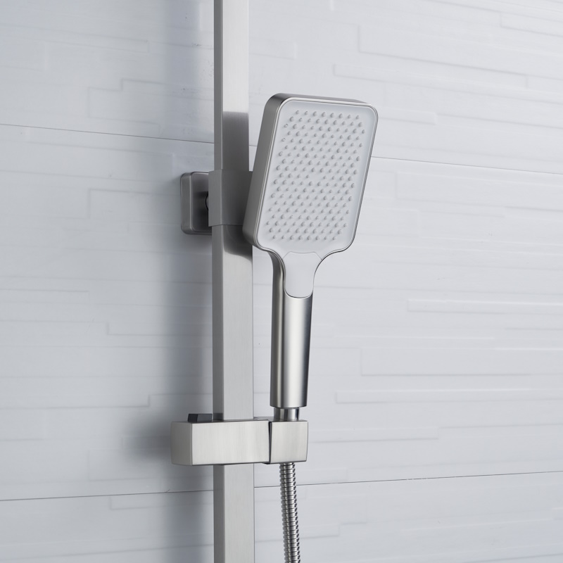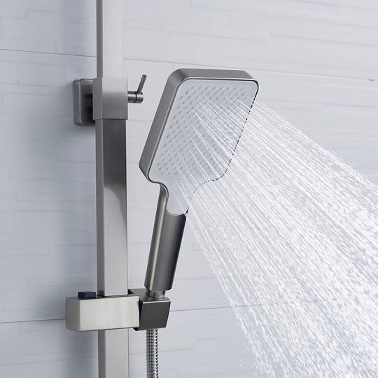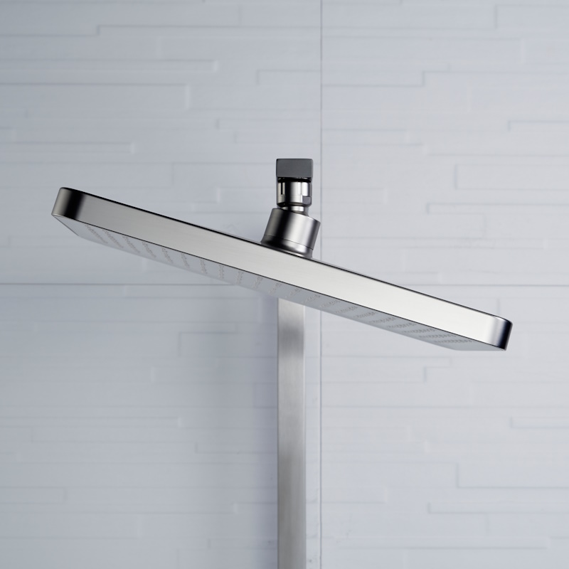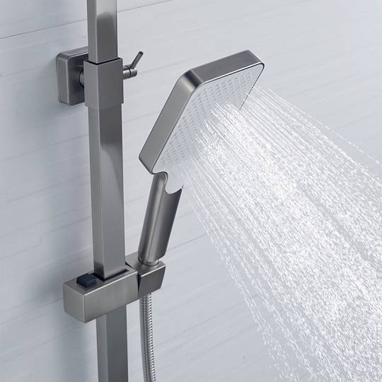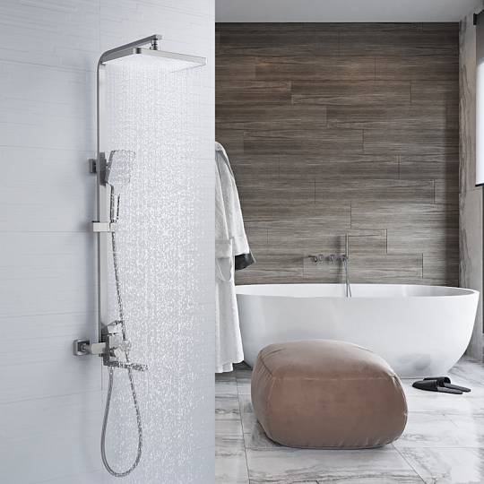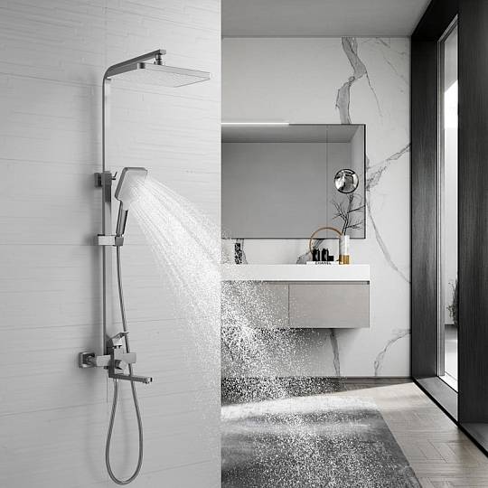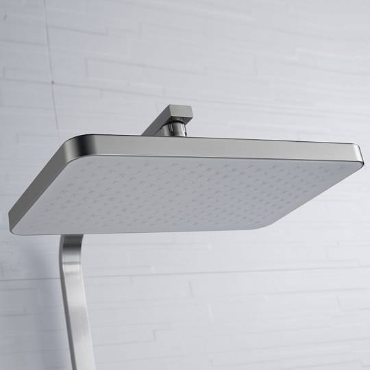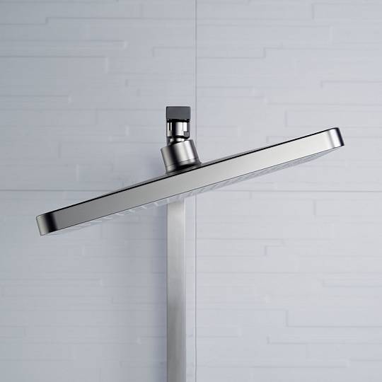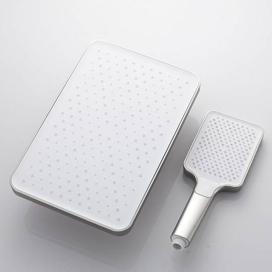 Верхний душ размером 320x210 мм из ABS-пластика регулируется по высоте благодаря телескопической штанге и по наклону с помощью встроенного шарнира, что обеспечивает максимальный комфорт и удобство использования. Самоочищающиеся силиконовые форсунки предотвращают образование известкового налета и сохраняют чистоту и силу потока воды.