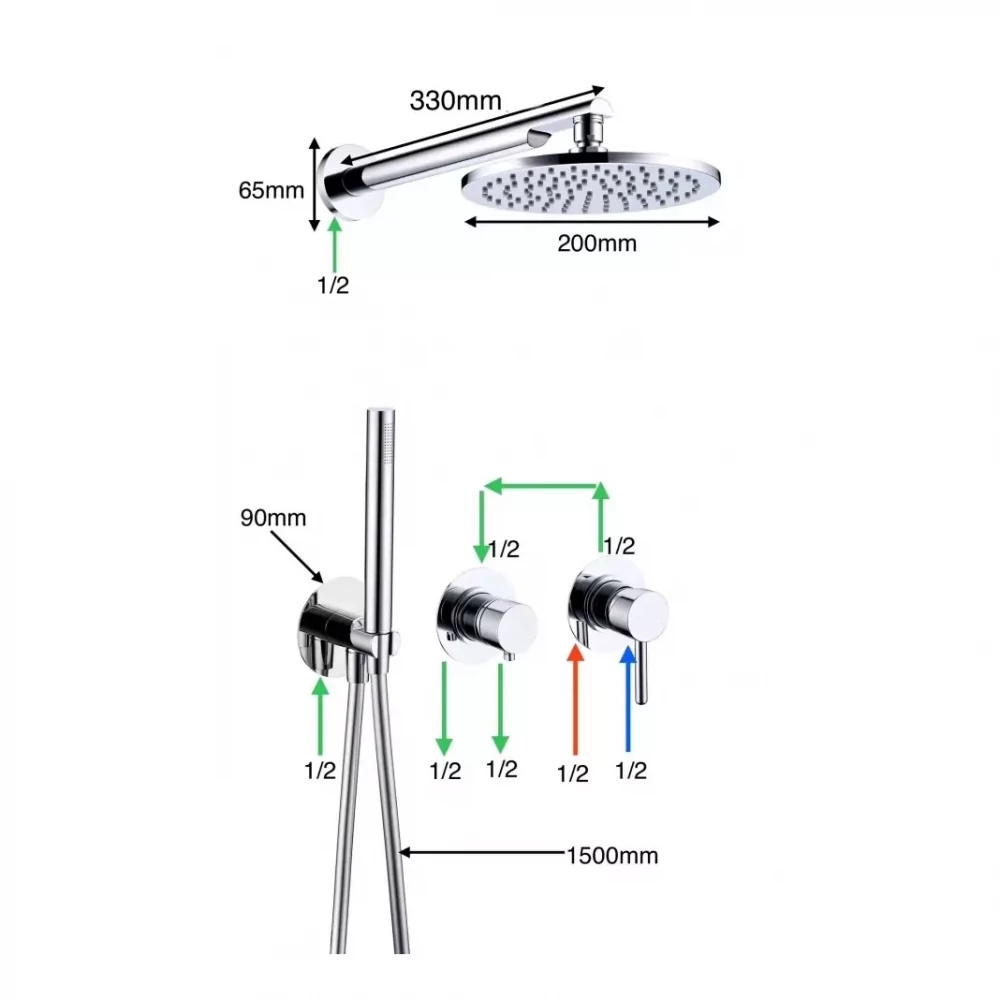 Смеситель, внутренняя часть, шланговое подключение, держатель душевой лейки, лейка, душевой шланг, верхний душ с кронштейном