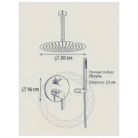 Смеситель, внутренняя часть, шланговое подключение с держателем лейки, душевой шланг, верхний душ с кронштейном