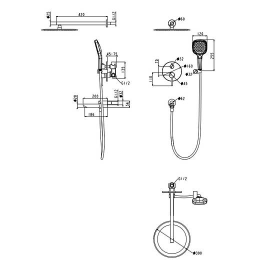 Смеситель, внутренняя часть, шланговое подключение с изливом, держатель душевой лейки, лейка, душевой шланг, верхний душ с кронштейном