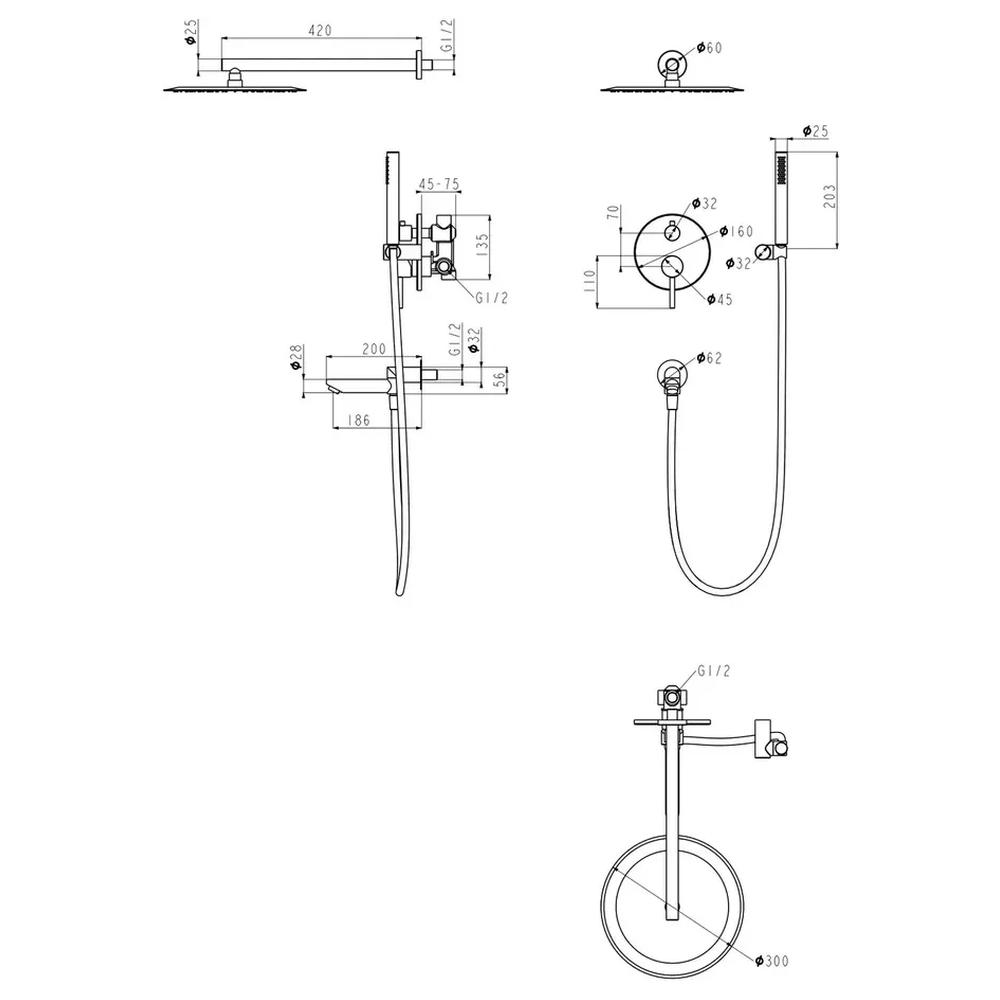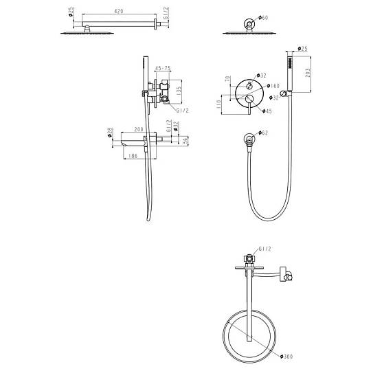 Смеситель, внутренняя часть, шланговое подключение с изливом, держатель душевой лейки, лейка, душевой шланг, верхний душ с кронштейном