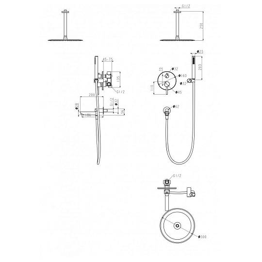 Смеситель, внутренняя часть, шланговое подключение с изливом, держатель душевой лейки, лейка, душевой шланг, верхний душ с кронштейном