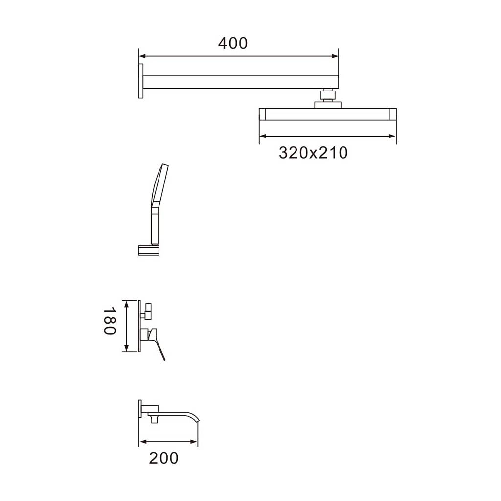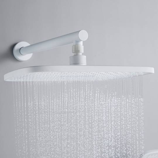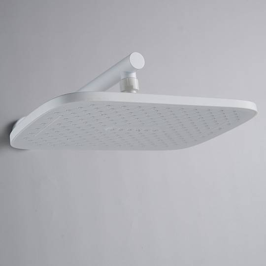 Верхний душ прямоугольной формы размером 320х210 мм выполнен из ABS-пластика с силиконовыми форсунками, которые легко очищаются от известкового налета. Верхний душ крепится к настенному кронштейну длиной 40 см через шарнир, позволяющий поворачивать его по всей оси для удобства использования.