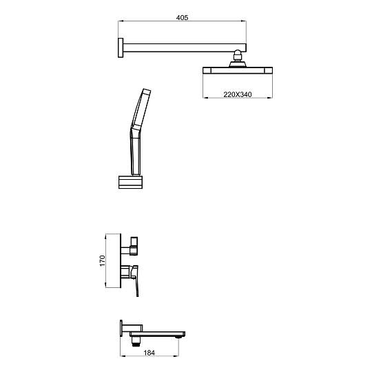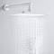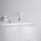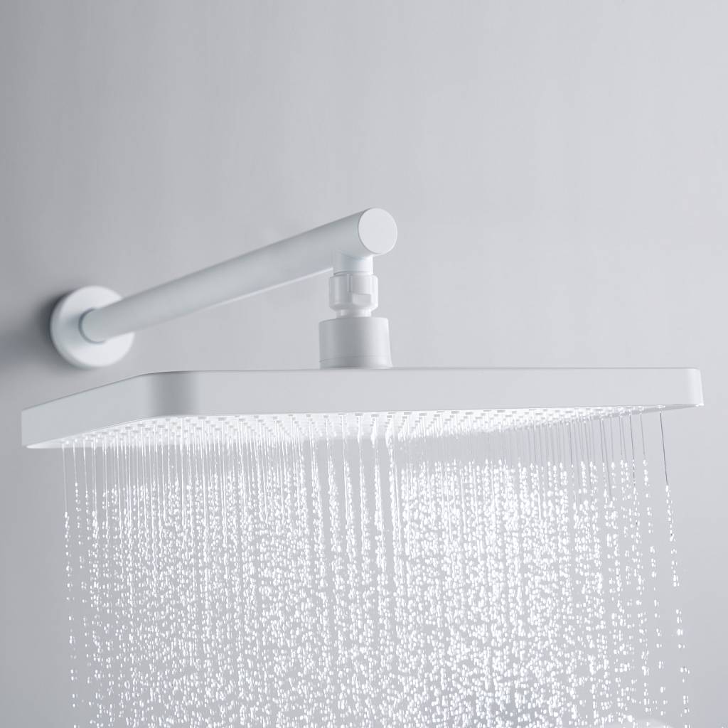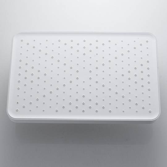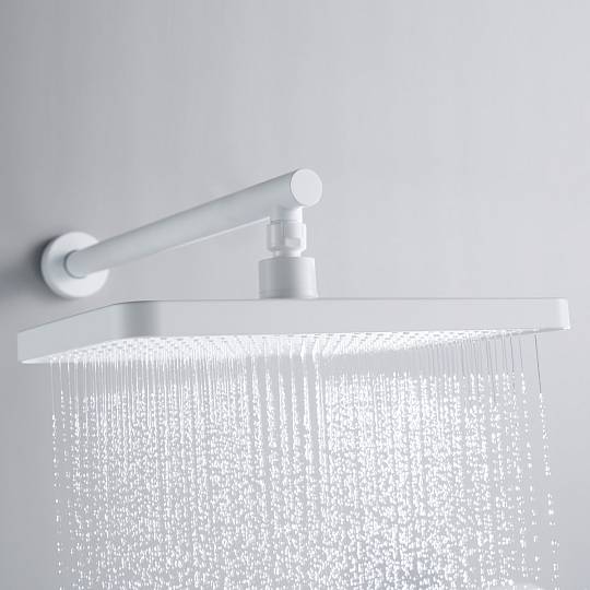 Верхний душ прямоугольной формы (340 × 220 мм) изготовлен из качественного ABS‑пластика и оснащён силиконовыми форсунками. Такие форсунки не только обеспечивают приятный водный поток, но и легко очищаются от известкового налёта. Душ крепится к настенному кронштейну длиной 40 см через шарнирное соединение, благодаря чему его можно поворачивать по всей оси, настраивая под индивидуальные предпочтения.
