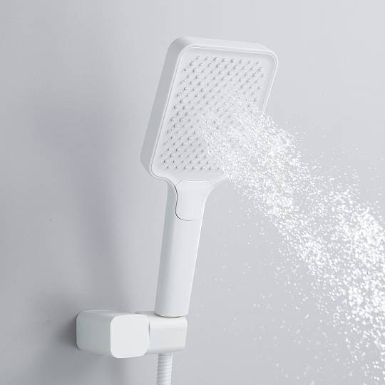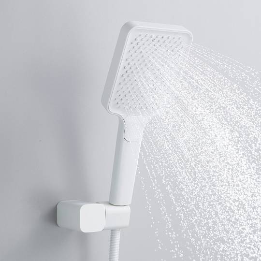 В комплект также входит ручная душевая лейка из ABS‑пластика с тремя режимами струи. Силиконовые форсунки лейки упрощают уход за изделием, а настенный держатель позволяет регулировать её наклон для максимально комфортного использования.