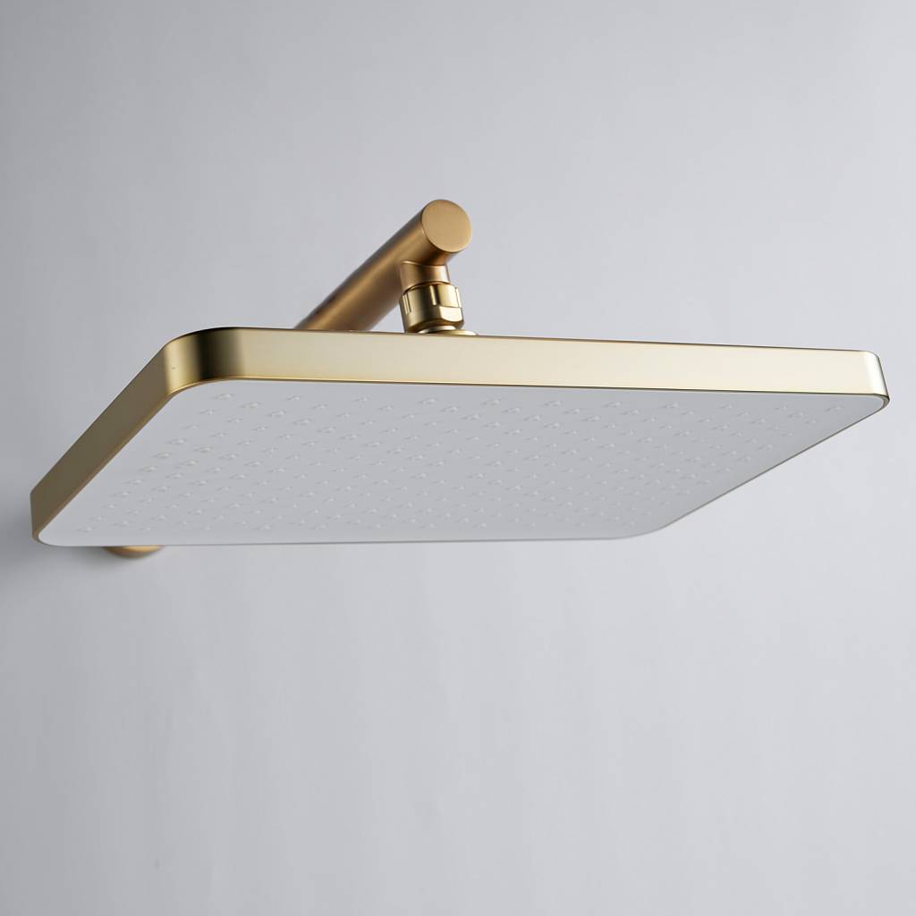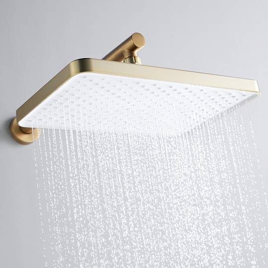 Верхний душ прямоугольной формы (340 × 220 мм) изготовлен из качественного ABS‑пластика и оснащён силиконовыми форсунками. Такие форсунки не только обеспечивают приятный водный поток, но и легко очищаются от известкового налёта. Душ крепится к настенному кронштейну длиной 40 см через шарнирное соединение, благодаря чему его можно поворачивать по всей оси, настраивая под индивидуальные предпочтения.