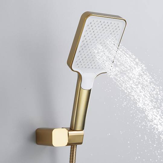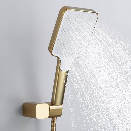 В комплект также входит ручная душевая лейка из ABS‑пластика с тремя режимами струи. Силиконовые форсунки лейки упрощают уход за изделием, а настенный держатель позволяет регулировать её наклон для максимально комфортного использования.