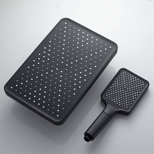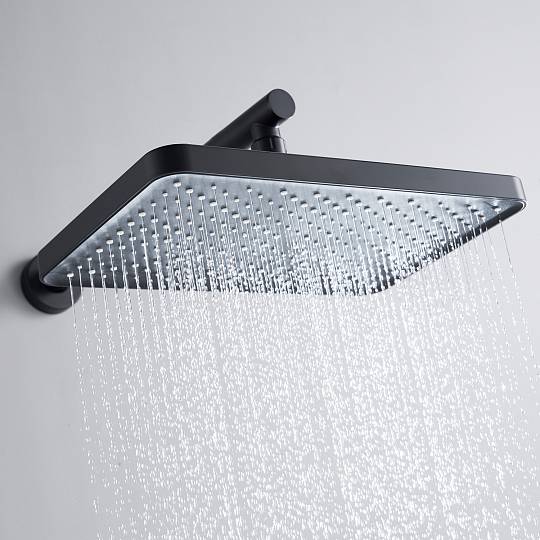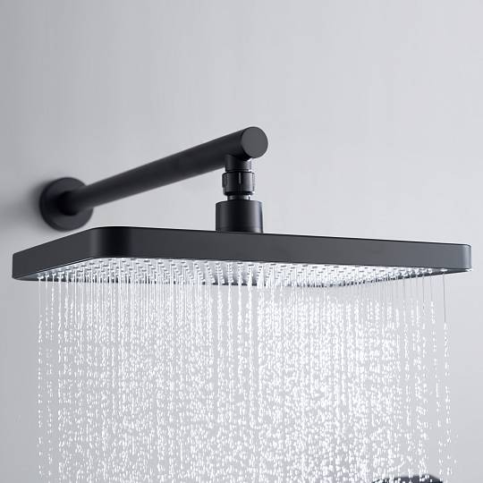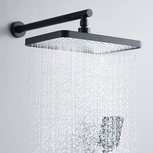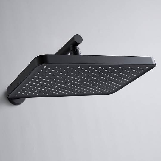 Верхний душ прямоугольной формы (340 × 220 мм) изготовлен из качественного ABS‑пластика и оснащён силиконовыми форсунками. Такие форсунки не только обеспечивают приятный водный поток, но и легко очищаются от известкового налёта. Душ крепится к настенному кронштейну длиной 40 см через шарнирное соединение, благодаря чему его можно поворачивать по всей оси, настраивая под индивидуальные предпочтения.