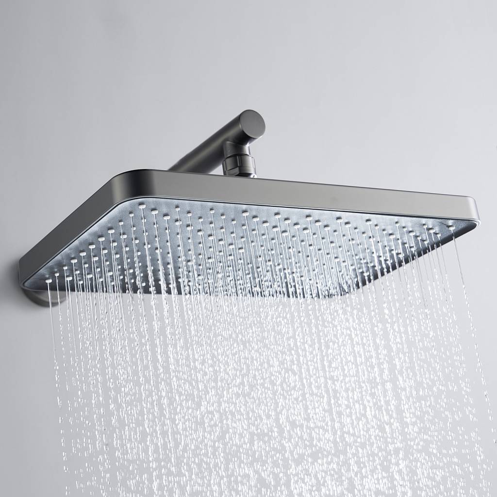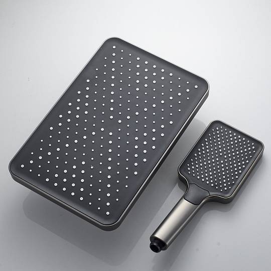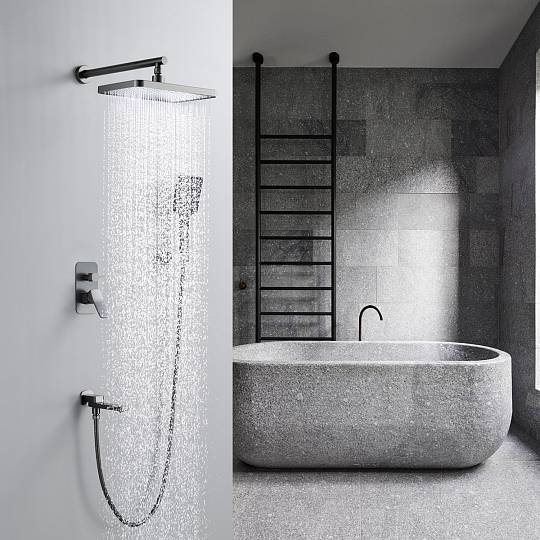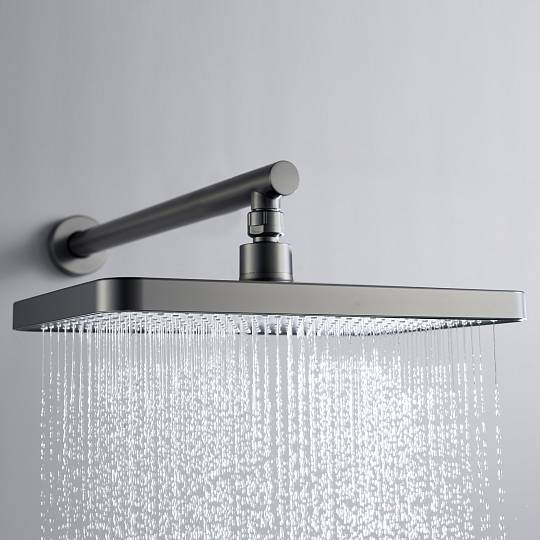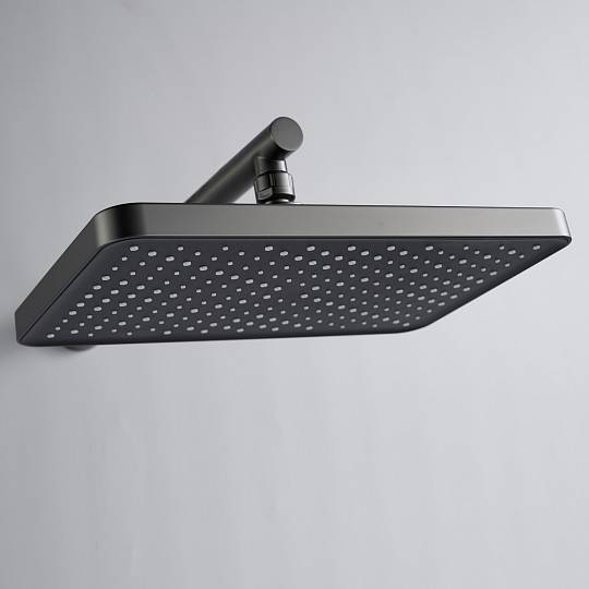 Верхний душ прямоугольной формы (340 × 220 мм) изготовлен из качественного ABS‑пластика и оснащён силиконовыми форсунками. Такие форсунки не только обеспечивают приятный водный поток, но и легко очищаются от известкового налёта. Душ крепится к настенному кронштейну длиной 40 см через шарнирное соединение, благодаря чему его можно поворачивать по всей оси, настраивая под индивидуальные предпочтения.