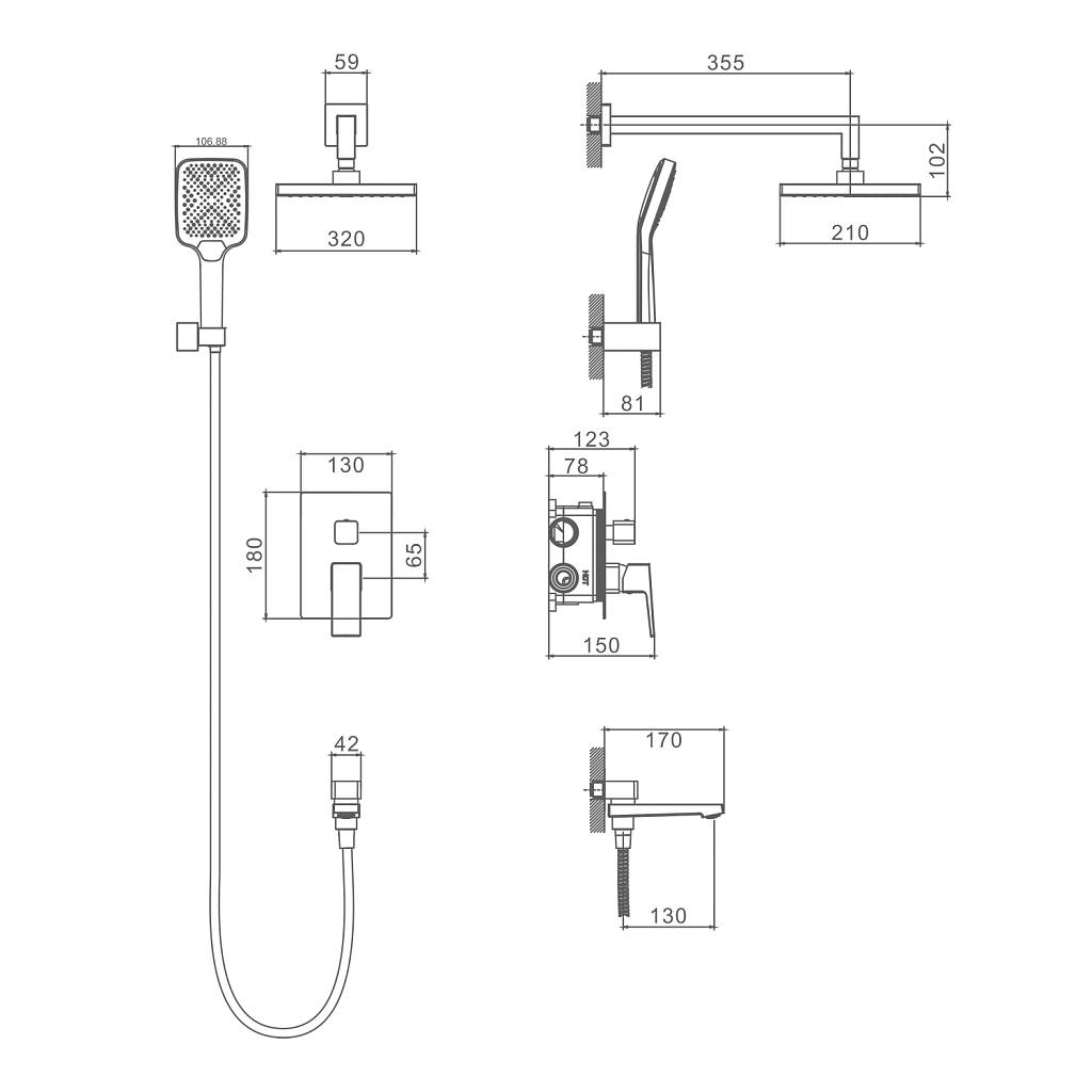 Форма верхнего душа:  прямоугольная. Размер верхнего душа (ШхД): 320х210 мм. Количество режимов струи ручного душа: 3. Монтаж: встраиваемый. Излив - функция переключения.