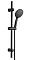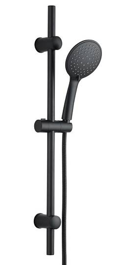 Черный душевой гарнитур. 1.Стойка из нержавеющей стали,высота 655 мм, диаметр 22мм  2. Ручная лейка ABC-пластик, 3 режима, диаметр 120 мм  3.Шланг черный в металлизированной оплетке 1,5 м. 4. Держатель для ручного душа и плавающие крепления к стене АВС-пластик.