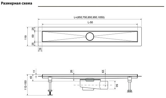 Водоотводящий желоб из нержавеющей стали; декоративная панель; заглушка монтажная; поворотный сифон DN50, выход вбок; комплект регулируемых опор; стакан с мембраной; улавливатель волос и мусора; гидроизоляционная лента; сервисный ключ