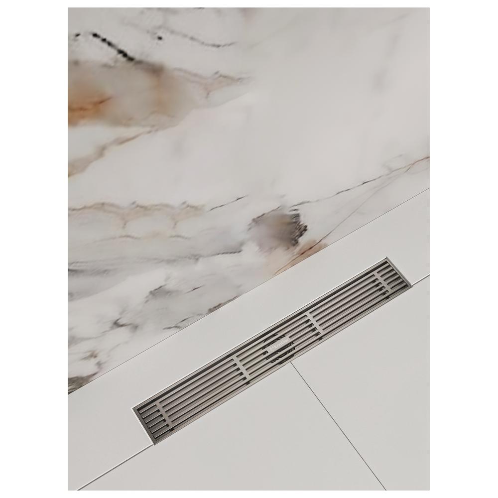 Линейный трап в цвете матовая сталь. Комплектуется сухим затвором и сеткой для волос, пропускная способность 36 л/мин. Дизайн выполнен в виде стильных горизонтальных решёток, которые придают душевой зоне современный и аккуратный внешний вид.