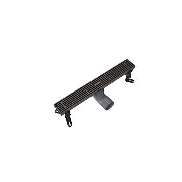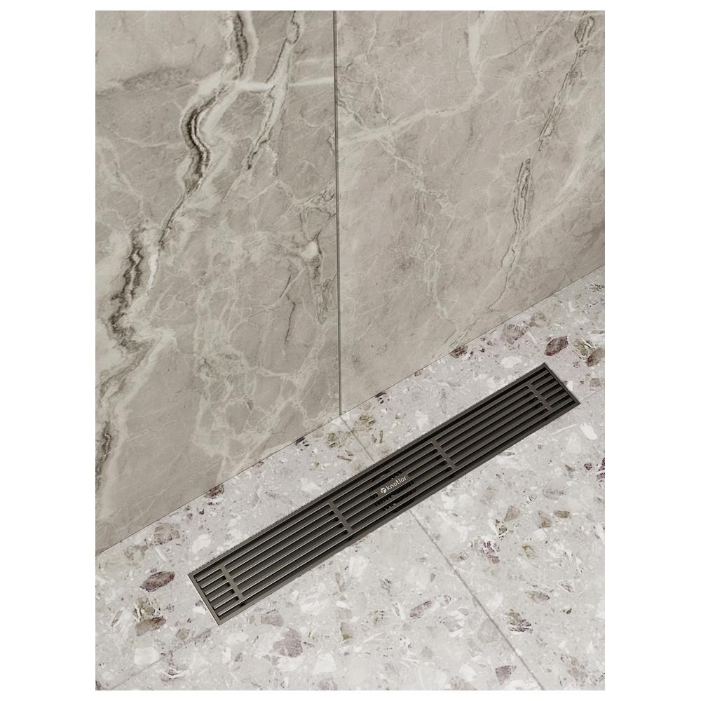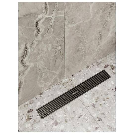 Линейный трап в отделке вороненая сталь. Надежная конструкция из нержавеющей стали и современный дизайн. Дизайн выполнен в виде стильных горизонтальных решёток, которые придают душевой зоне аккуратный внешний вид.