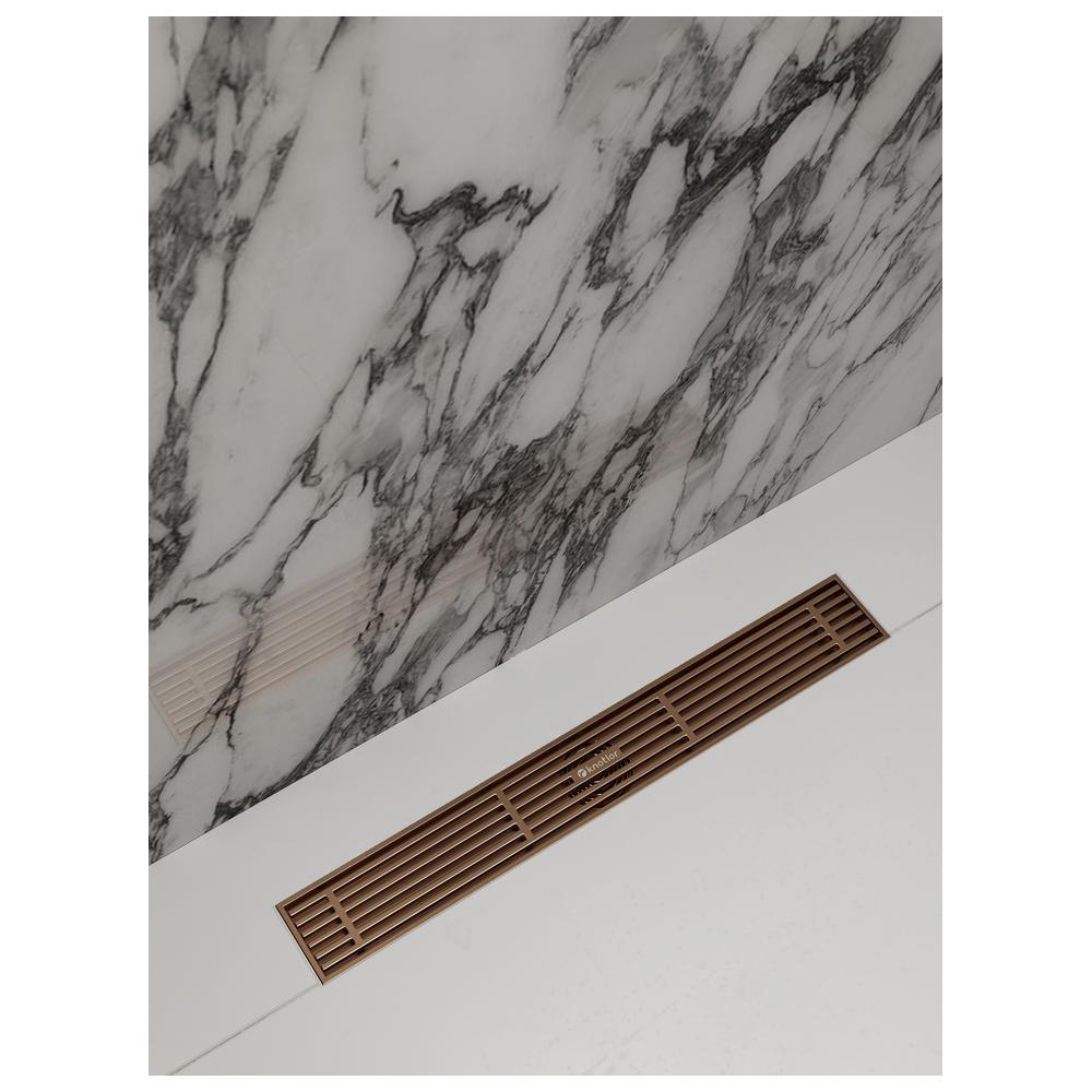 Линейный трап в цвете бронза. Оснащен сухим затвором и комплектом для удобного монтажа. Дизайн выполнен в виде стильных горизонтальных решёток, которые придают душевой зоне современный и аккуратный внешний вид.