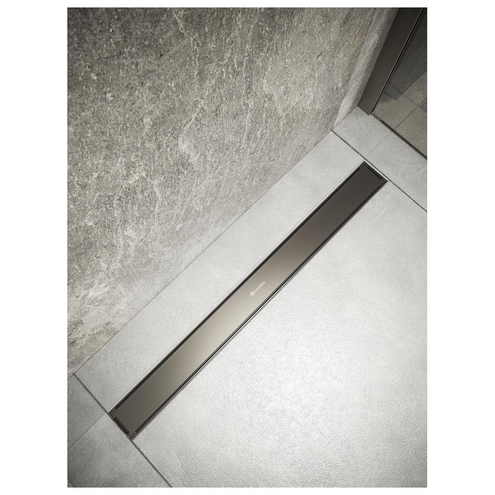 Линейный трап с двухсторонней декоративной решеткой в отделке вороненая сталь. Надежная конструкция и эффективный слив воды до 36 л/мин.