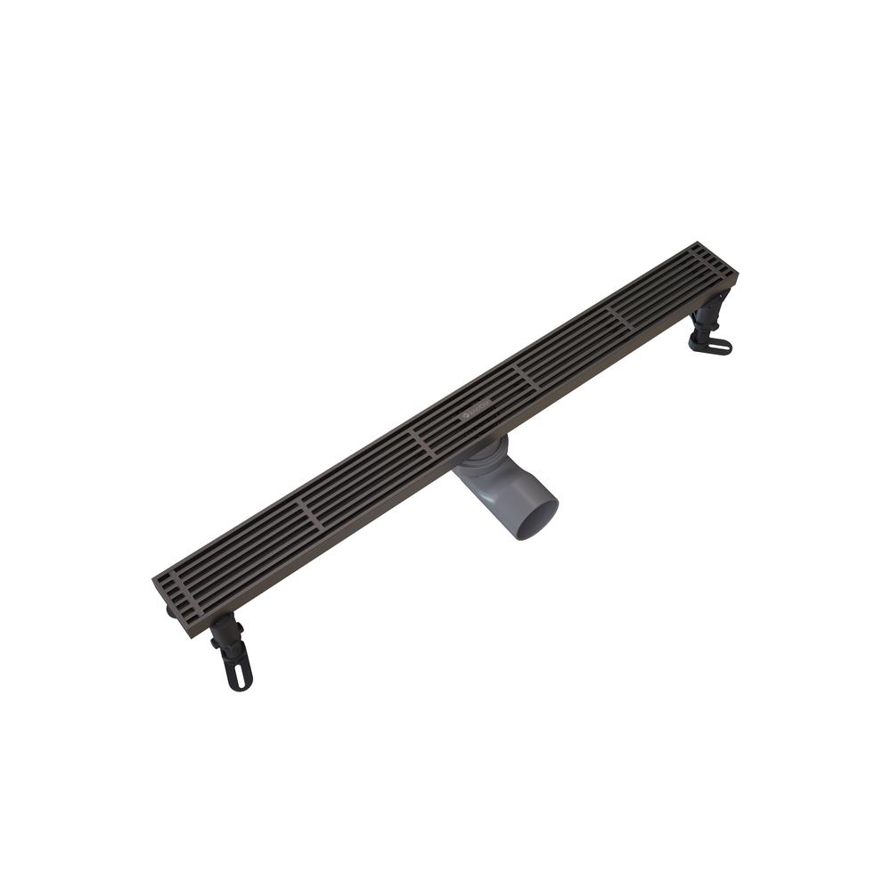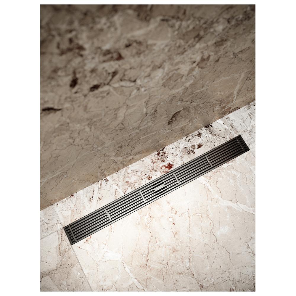 Линейный трап в отделке вороненая сталь. Надежное решение для душевых зон с современным дизайном. Дизайн выполнен в виде стильных горизонтальных решёток, которые придают душевой зоне аккуратный внешний вид.