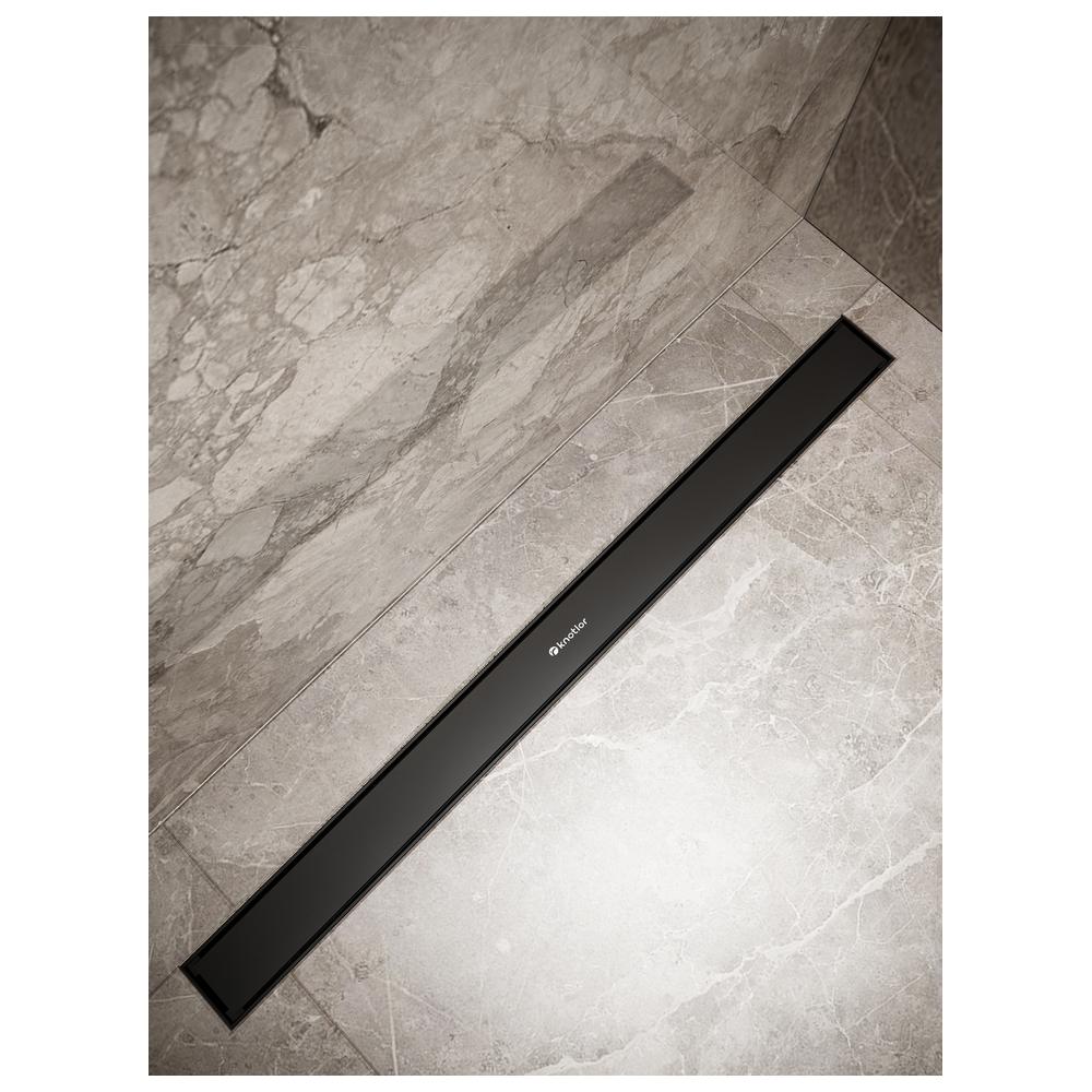 Линейный трап с двухсторонней декоративной решеткой в цвете матовый черный. Современный дизайн и пропускная способность 36 л/мин обеспечивают комфорт эксплуатации.