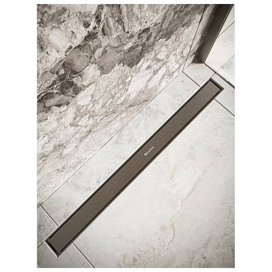 Линейный трап с двухсторонней декоративной решеткой в отделке вороненая сталь. Надежное решение для душевых зон с эффективным сливом воды.