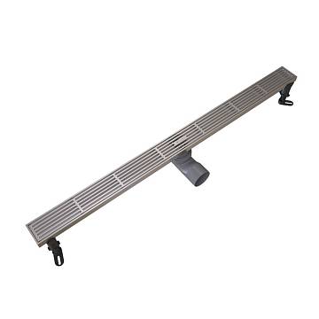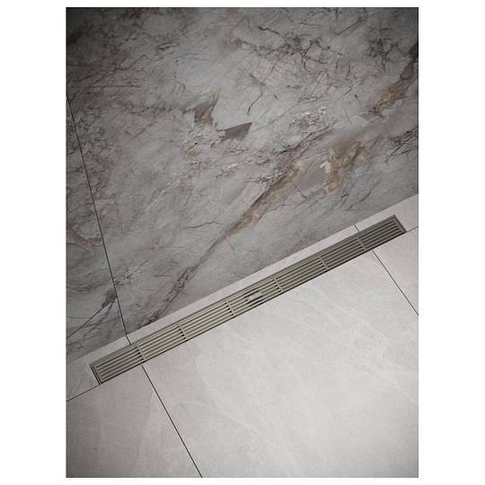 Линейный трап в цвете матовая сталь. Подходит для просторных душевых зон, пропускная способность 36 л/мин. Дизайн выполнен в виде стильных горизонтальных решёток, которые придают душевой зоне современный и аккуратный внешний вид.