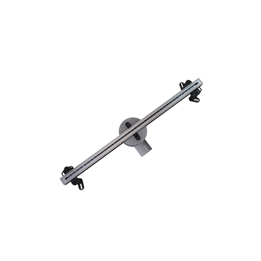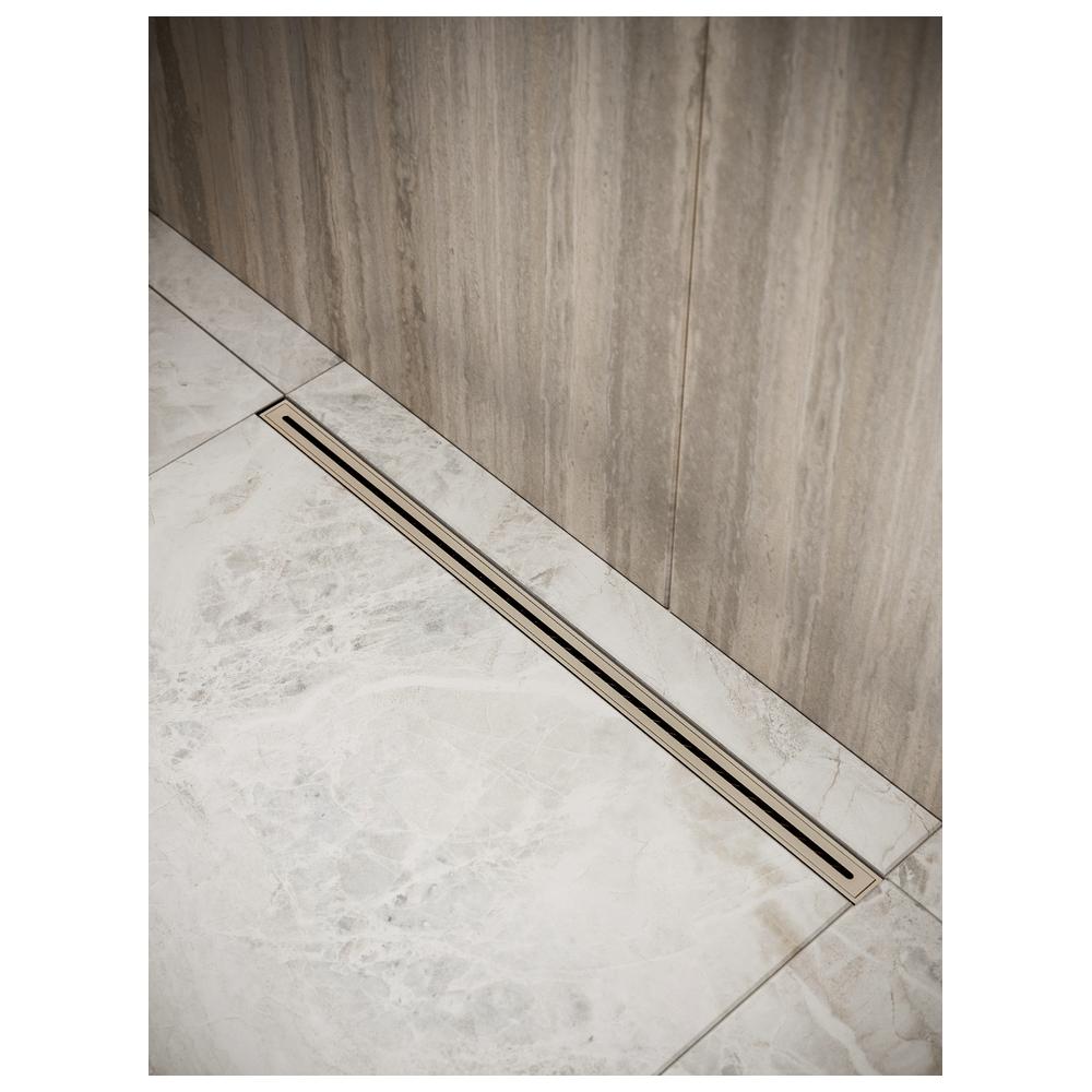Ультраузкий щелевой трап в цвете матовая сталь. Оснащен сухим затвором и регулируемыми опорами, пропускная способность 24 л/мин.
