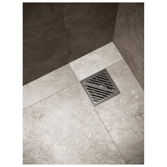 Квадратный трап в отделке вороненая сталь. Высокая пропускная способность 65 л/мин делает модель подходящей для душевых с интенсивным водоотводом.