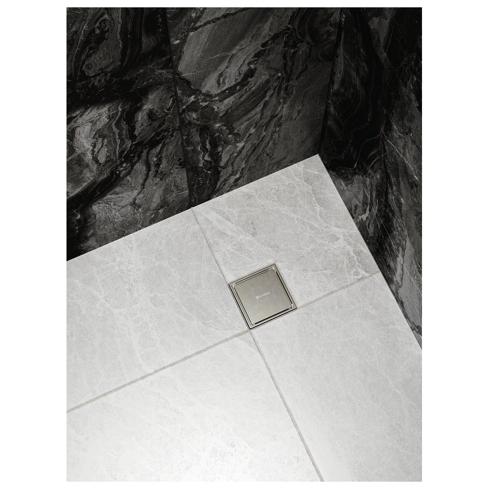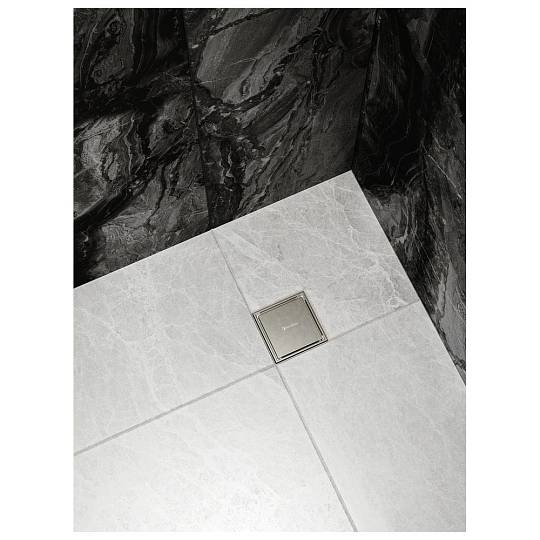 Квадратный трап из нержавеющей стали в цвете матовая сталь. Имеет сухой затвор и решетку для волос из нержавеющей стали, пропускная способность 36 л/мин.