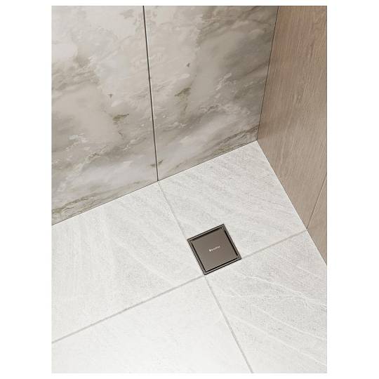 Квадратный трап в отделке вороненая сталь. Оснащен магнитным сухим затвором и металлической решеткой для волос, пропускная способность 36 л/мин.